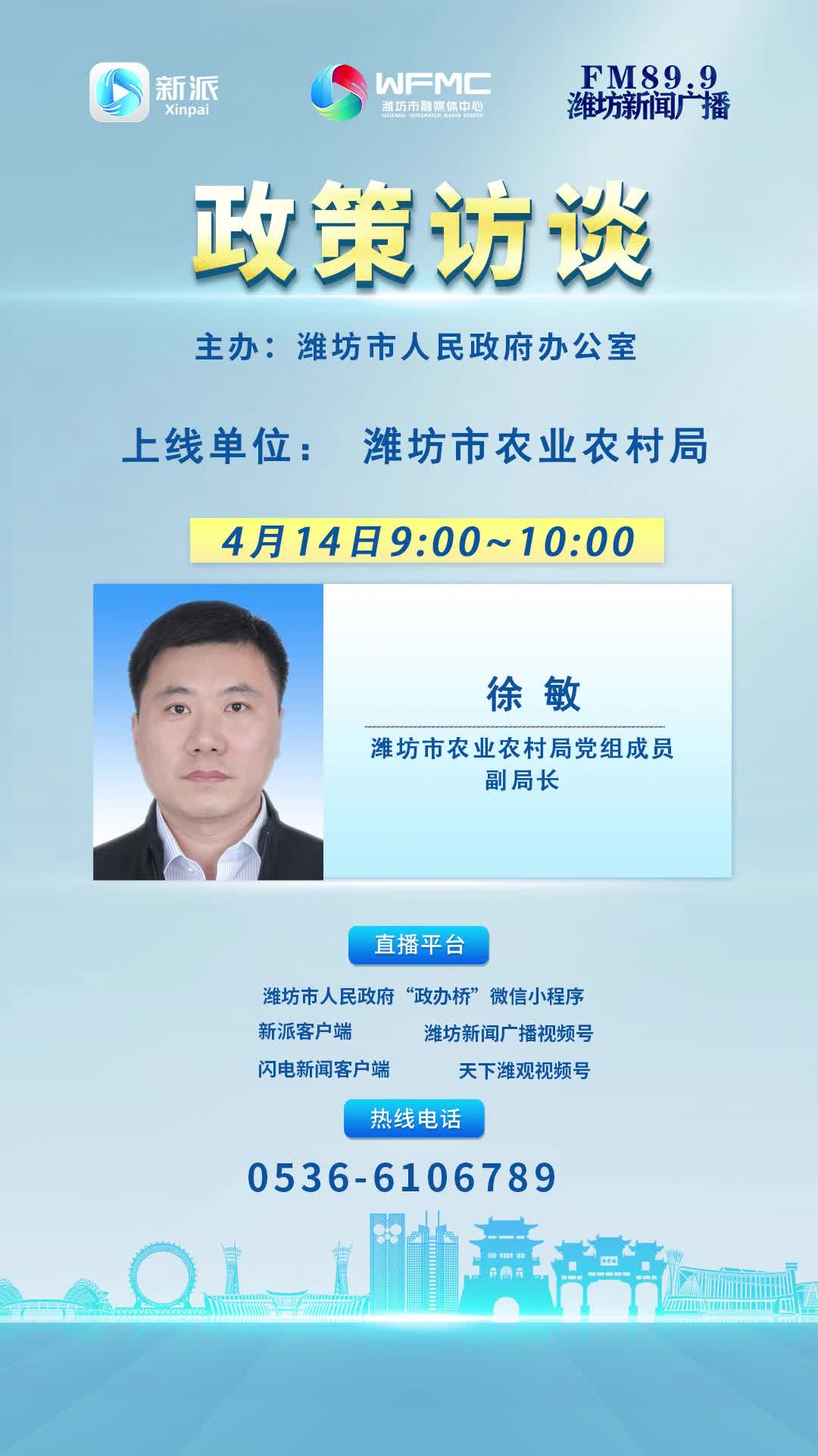4月14日上午9:00~10 00,濰坊市農(nóng)業(yè)農(nóng)村局黨組成員、副局長徐敏將走進市融媒體中心新聞頻率《政策訪談》欄目直播間,敬請關(guān)注!