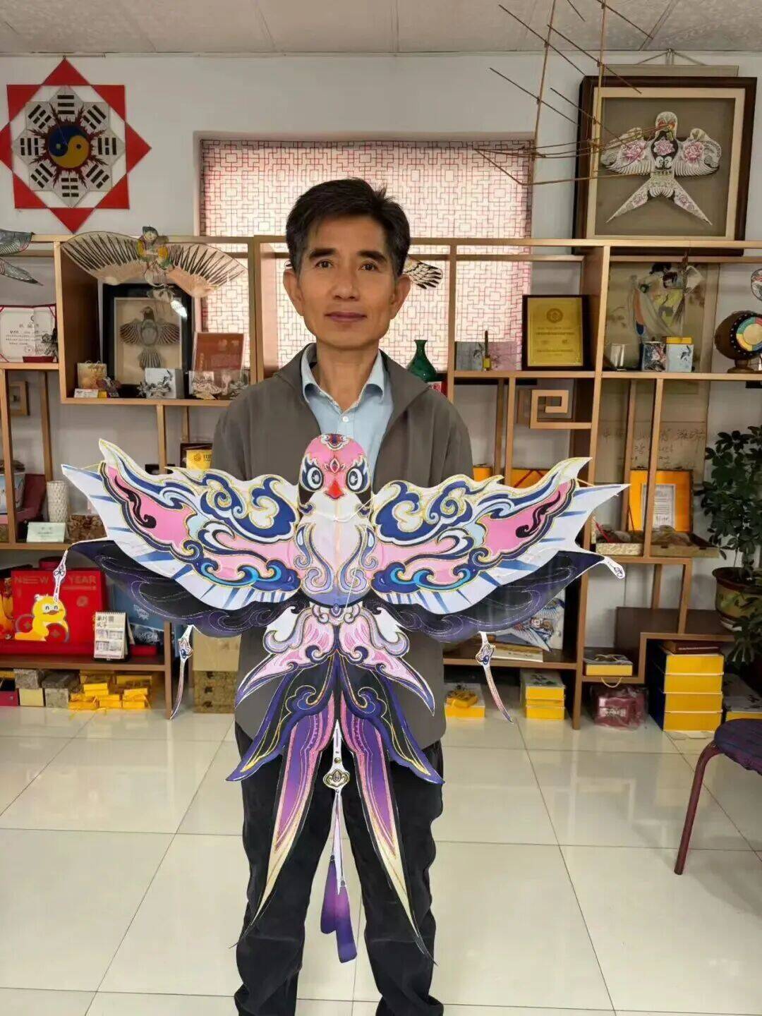 郭洪利展示與“超自然行動組”手游合作的風(fēng)箏。